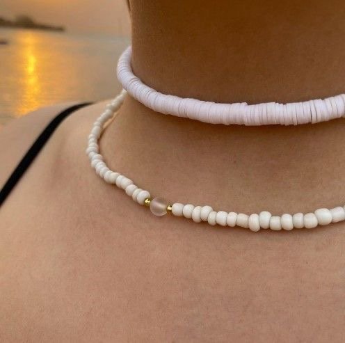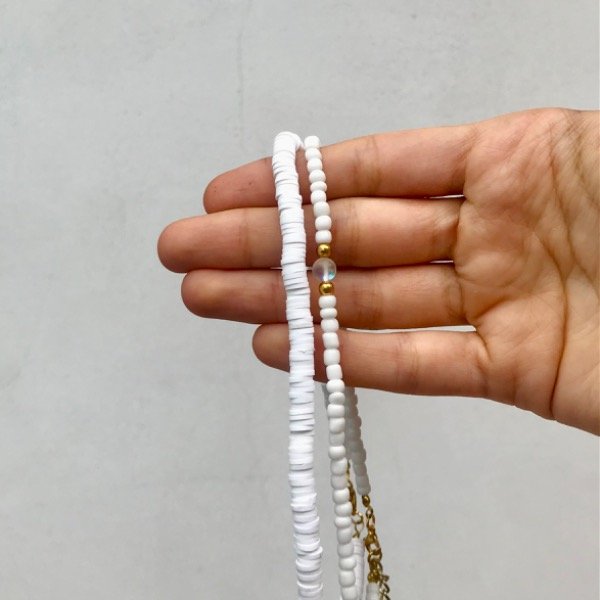 Conjunto collar de fimos blancos y collar de mostacillas blancas con perla tornasolada. Ambos regulables con ganchito y cadena